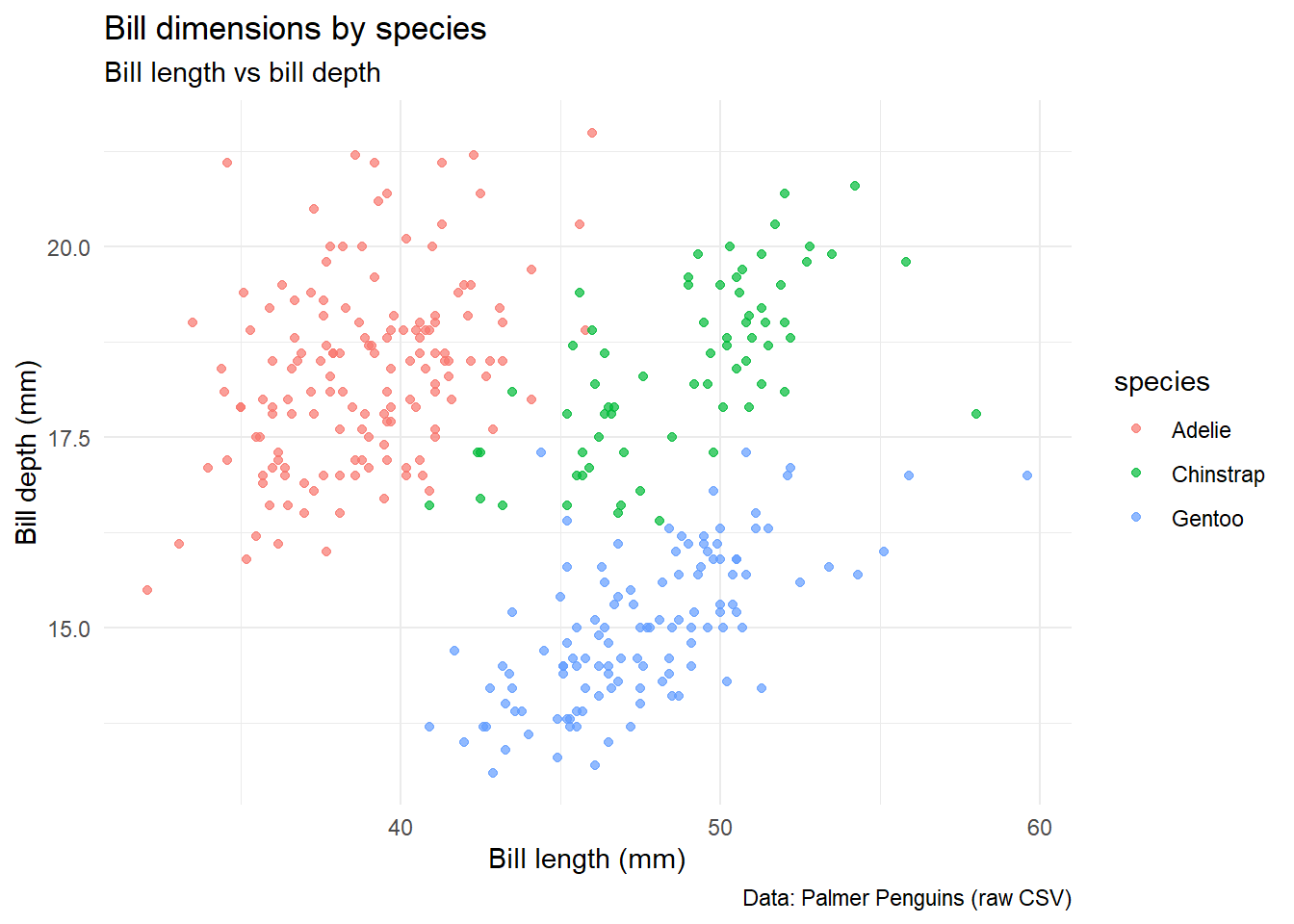 ggplot(peng_clean, aes(x = bill_length_mm, y = bill_depth_mm, color = species)) +geom_point(alpha =0.7) +labs(title ="Bill dimensions by species",subtitle ="Bill length vs bill depth",caption ="Data: Palmer Penguins (raw CSV)",x ="Bill length (mm)",y ="Bill depth (mm)") +theme_minimal()