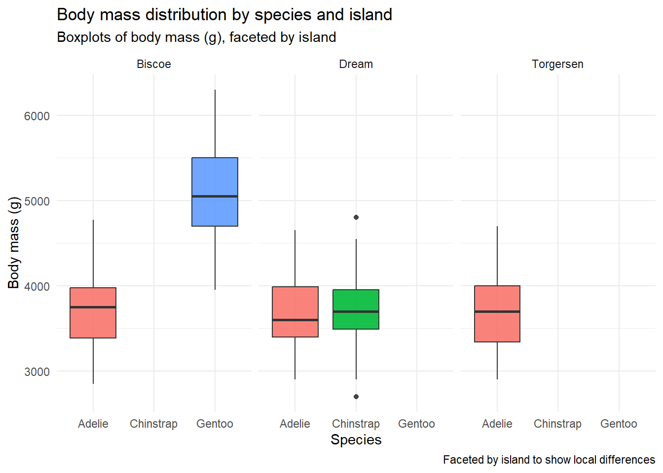 ggplot(peng_clean, aes(x = species, y = body_mass_g, fill = species)) +geom_boxplot(alpha =0.9) +facet_wrap(~ island) +labs(title ="Body mass distribution by species and island",subtitle ="Boxplots of body mass (g), faceted by island",caption ="Faceted by island to show local differences",x ="Species",y ="Body mass (g)") +theme_minimal() +theme(legend.position ="none")