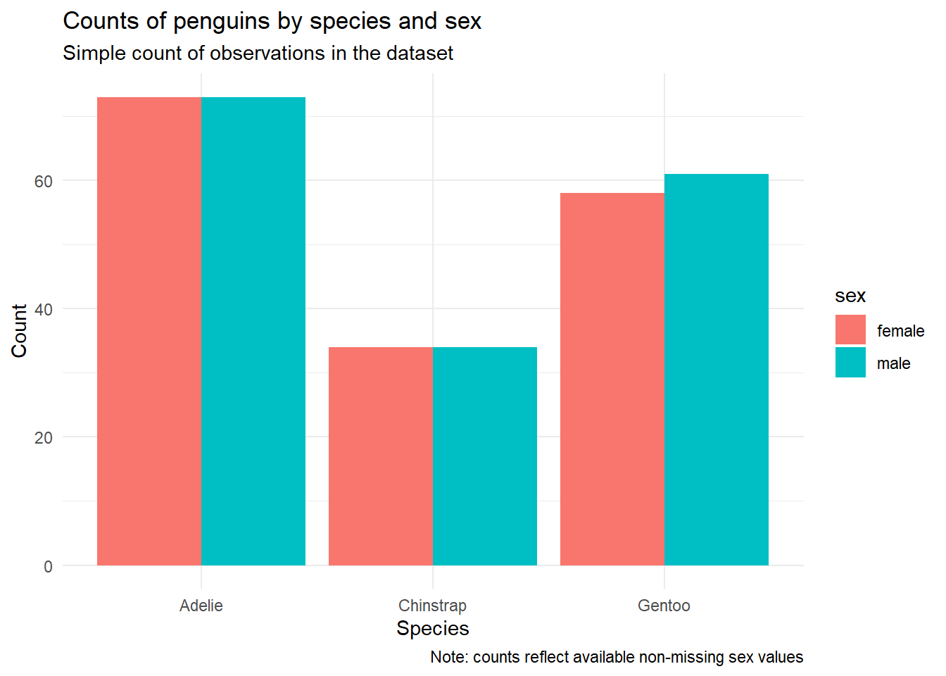 ggplot(peng_clean, aes(x = species, fill = sex)) +geom_bar(position ="dodge") +labs(title ="Counts of penguins by species and sex",subtitle ="Simple count of observations in the dataset",caption ="Note: counts reflect available non-missing sex values",x ="Species",y ="Count") +theme_minimal()